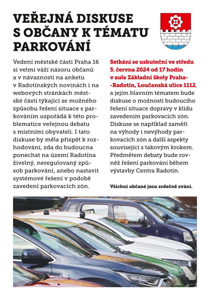 Vedení Městské části Praha 16 si velmi váží názoru občanů a v návaznosti na anketu v Radotínských novinách i na webových stránkách městské části týkající se možného způsobu řešení situace s parkováním uspořádá k této problematice veřejnou debatu s místními obyvateli. I tato diskuze by měla přispět k rozhodování, zda do budoucna ponechat na území Radotína živelný, neregulovaný způsob parkování, či nastavit systémové řešení v podobě zavedení parkovacích zón.
