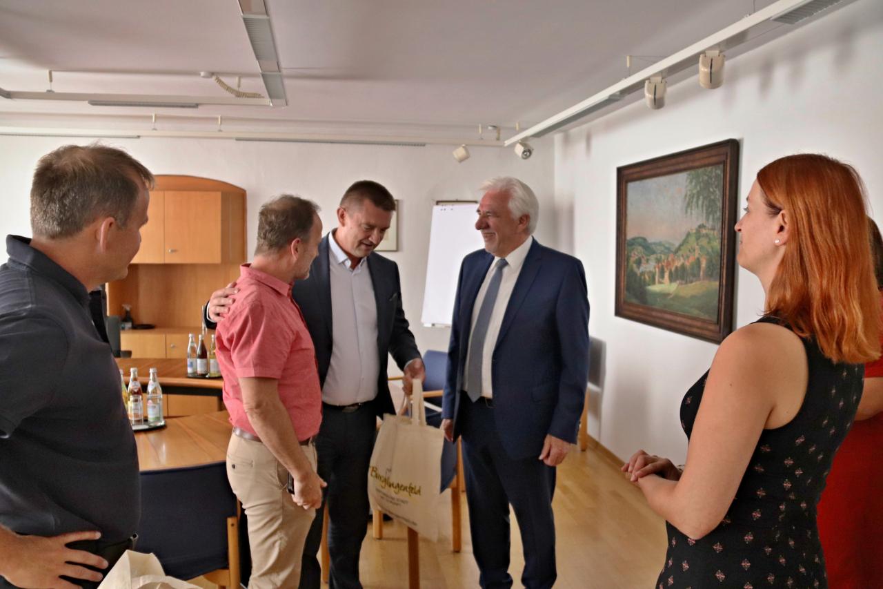 Následný program již byl standardní a plně pracovní: na radnici je přivítal 1. místostarosta Josef Gruber a jeho kolegyně a kolegové, včetně nové tajemnice úřadu. Hlavním cílem návštěv je ale inspirace a nové aktivity a stavby - tentokráte byla prohlídka města zaměřena na školské areály, kterými hosté prošli pod vedením šéfa městských investic Franze Hanedera. Bavorským přátelům se podařilo přes "koronavirové časy" postavit ve spolupráci s místním Červeným křížem zcela novou mateřskou školu a zásluhou akčního přístupu také rozestavět novou budovu místní základní školy - ta bude provedena v mimořádném stylu a bude sloužit pro nový, alternativní přístup k výuce žáků - místo všech dětí v jedné třídě a učících se pouze od svého učitele je více kladen důraz na samostatnost, práci ve skupinách a řešení samostatných úkolů třeba úplně mimo kmenovou učebnu ve velkém, přirozeně prosvětleném centrálním sále.