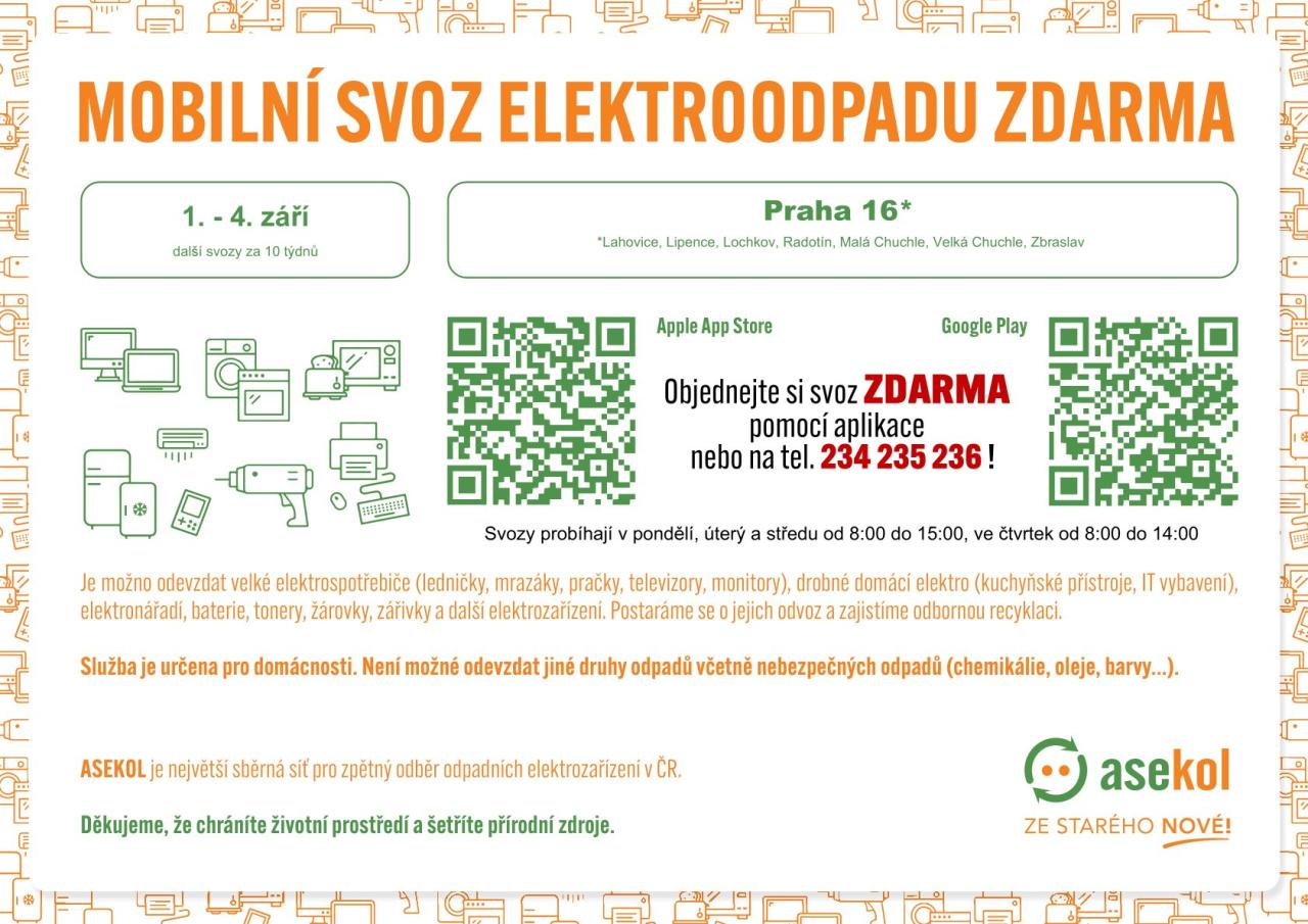 Domácnosti mají možnost objednat si odvoz elektrozařízení telefonicky na dispečinku (na tel. 234 235 236) nebo prostřednictvím aplikace (Svoz elektra):