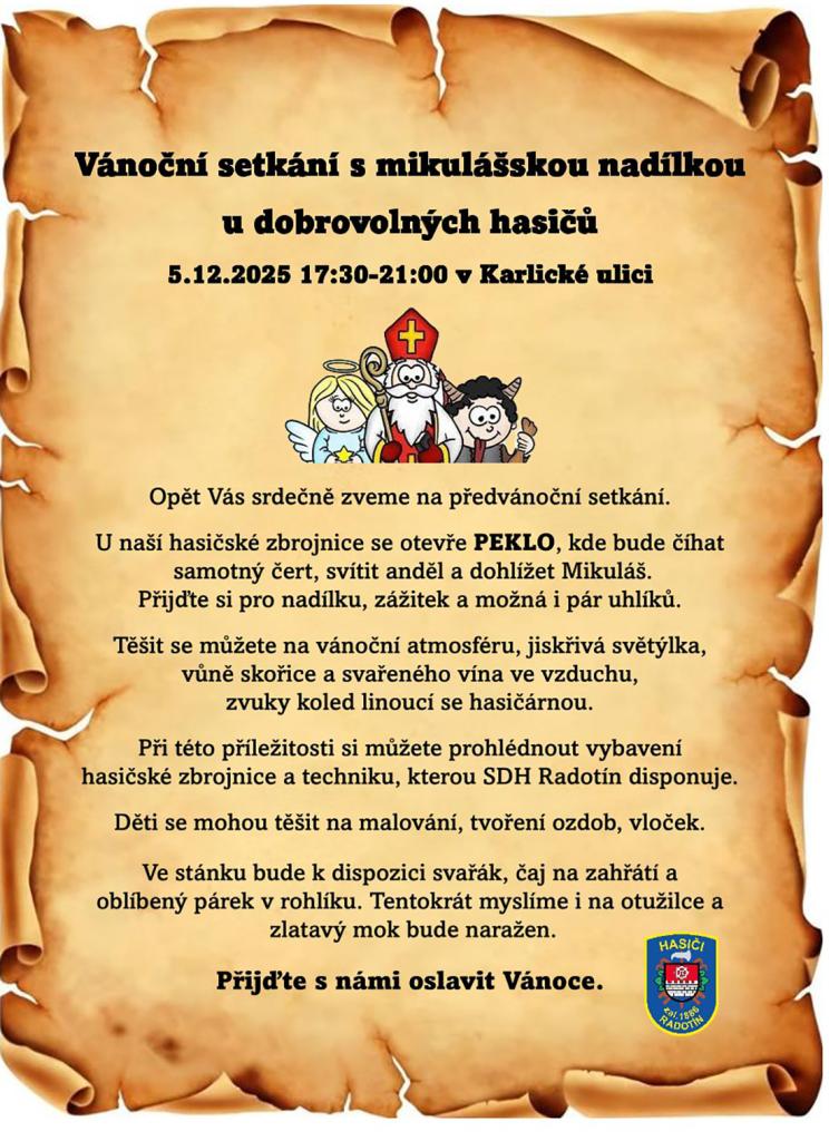 Členové Sboru dobrovolných hasičů si pro všechny malé i velké připravili v hasičské zbrojnici v Karlické ulici předvánoční setkání s občerstvením i prohlídkou hasičské techniky.