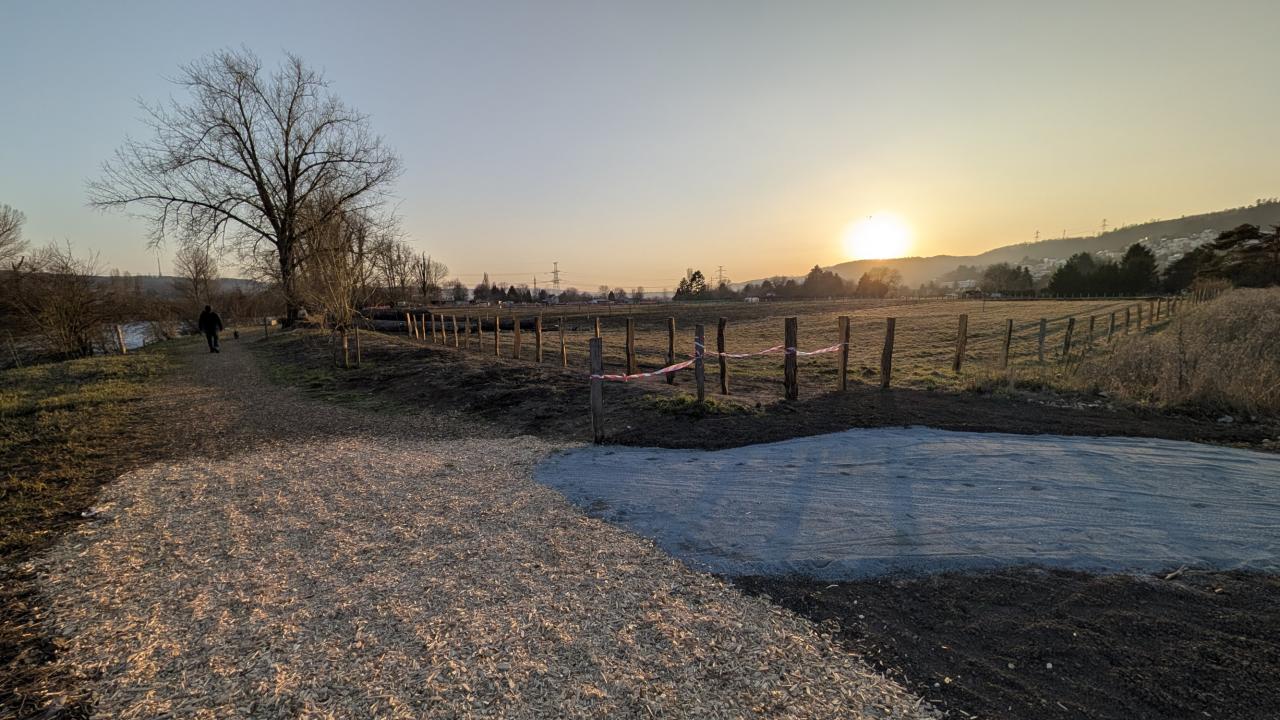 - Cesta blíže ke břehu řeky (s dřevní štěpkou) je určená pro pěší. 🚶♀️